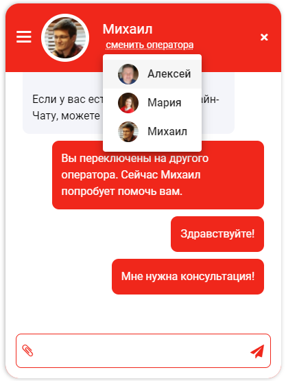 Весь основной функционал чата доступен посетителям сайта по умолчанию. Клиент может самостоятельно переключаться между операторами и выбрать именно того, с кем хочет общаться.