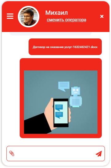 Во время переписки клиенту доступен функционал отправки файлов. При отправке видео и изображений доступен предпросмотр в окне чата без необходимости скачивать такие файлы.