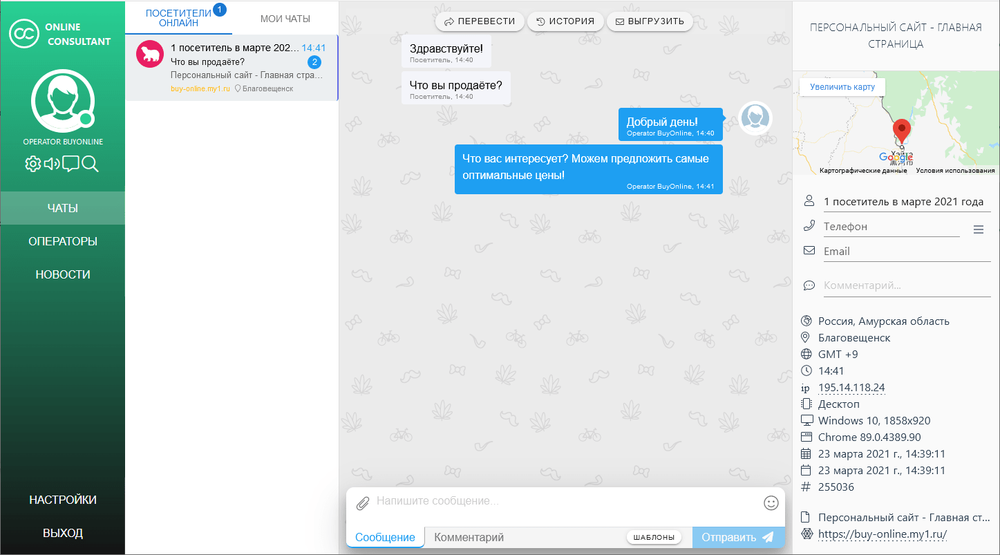 Оператор видит все сообщения и подробную информацию о каждом посетителе.
