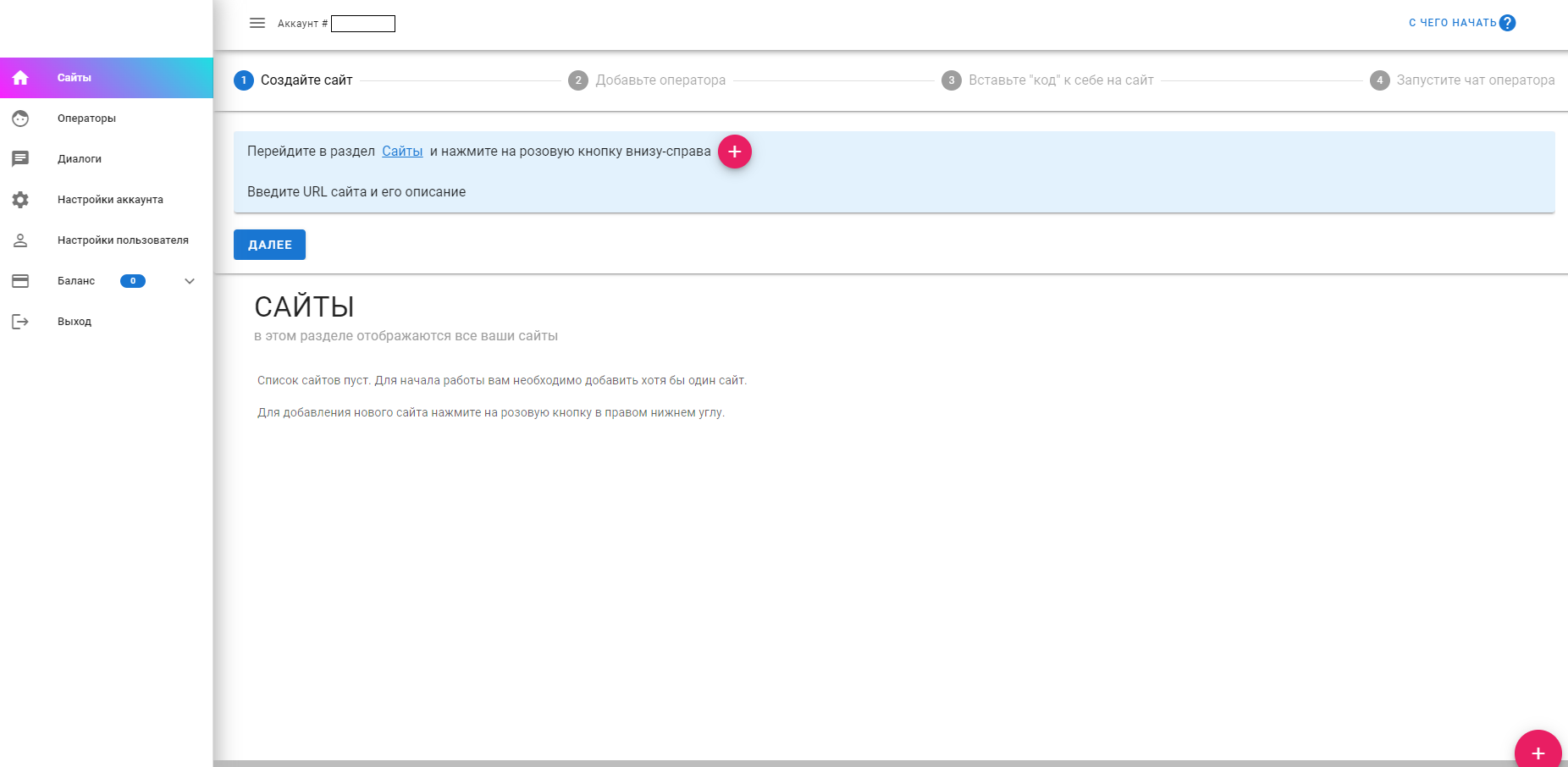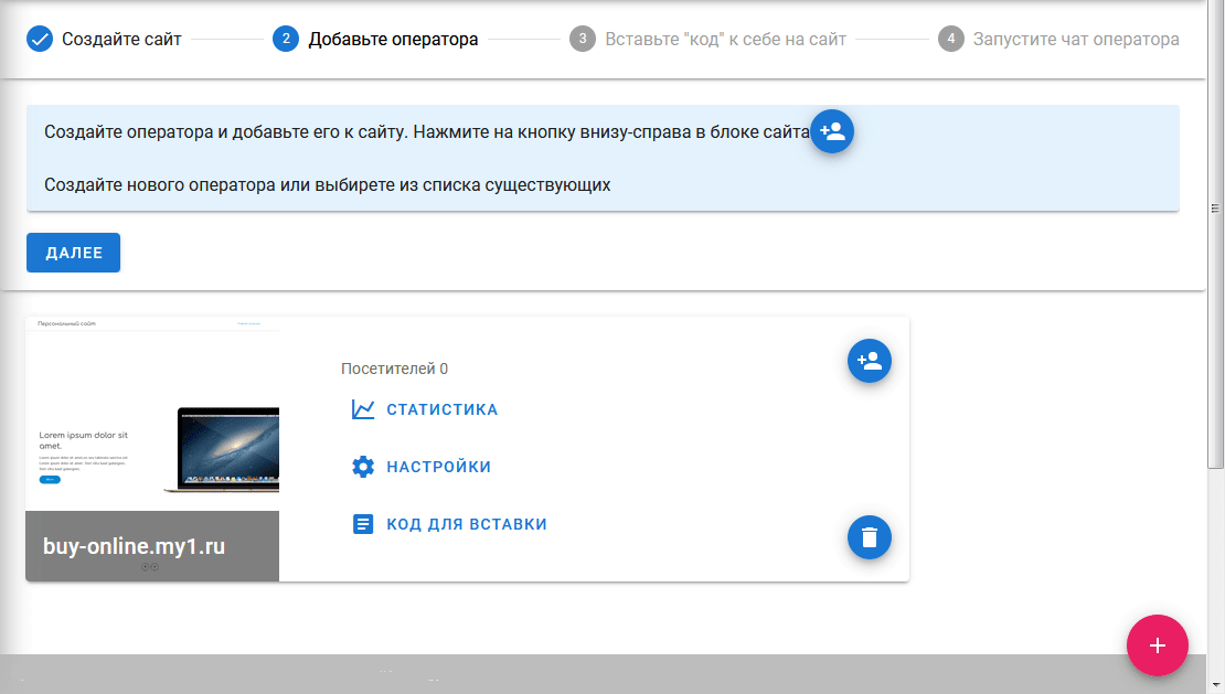Следующий шаг - добавление Оператора. В карточке созданного сайта нажмите кнопку добавления оператора.