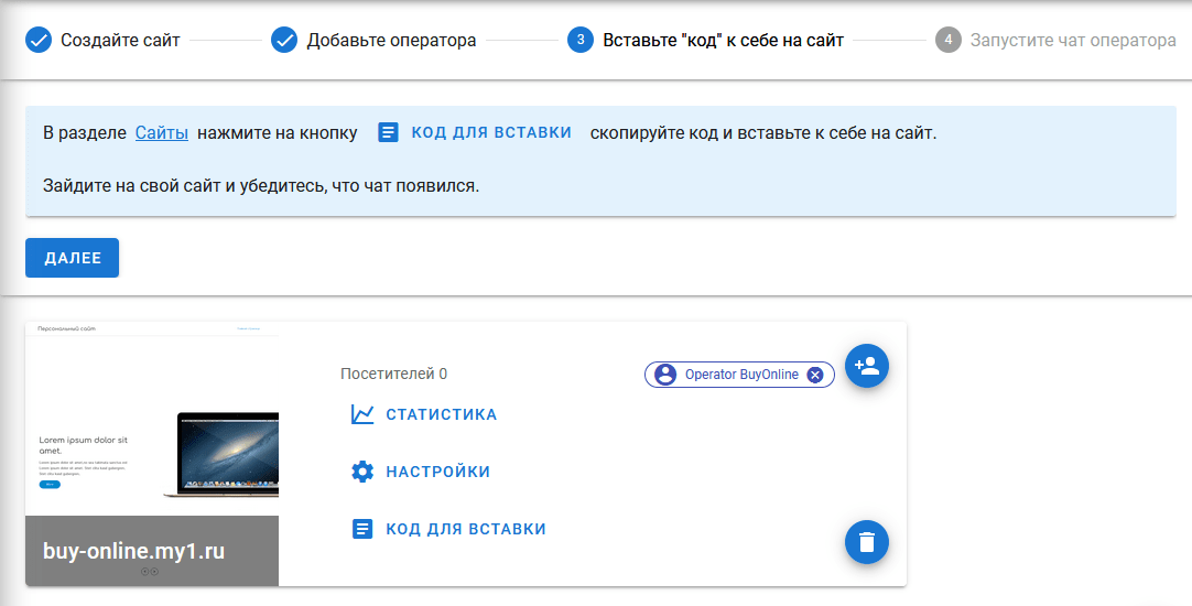 Сайт в систему добавили, оператора создали. Теперь необходимо внедрить код чата на ваш сайт. Нажмите на кнопку Код для вставки