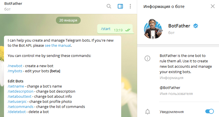 В Telegram находим специального бота @BotFather и запускаем его командой /start