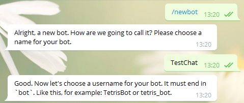 Командой /newbot создаём нового бота. Сперва укажем название бота: В нашем случае это TestChat