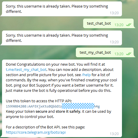 Если имя свободно и бот создался успешно — BotFather даст ссылку на канал с ботом и его API токен.